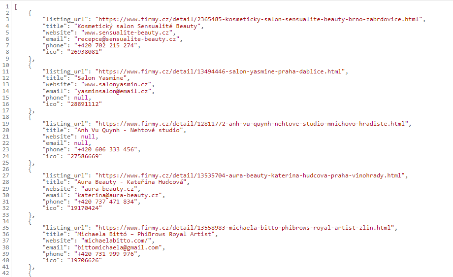 Naše společnost poskytuje služby parsování dat, které umožňují efektivní sběr a strukturování informací. Jedním z příkladů použití našich služeb je vytvoření databáze kosmetických salonů. V rámci tohoto procesu jsme schopni získat klíčové informace, jako jsou jméno (name), adresa (address), kontaktní údaje (e-mail a telefonní číslo), identifikační číslo organizace (IČO), popis služeb a hodnocení s recenzemi.